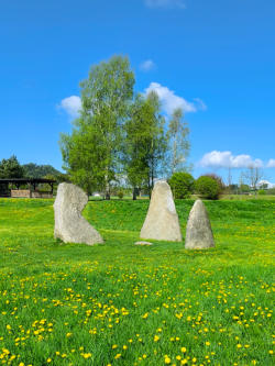 > Eine Installation aus drei Megalithen und einem Kosmogramm in Glas in der Mitte, welches der