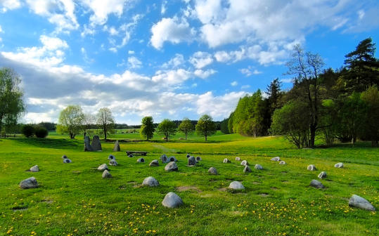 > Das Equilibrium bestehend aus 39 Steinen mit Kosmogrammen auf Bronzetafeln in zwei Spiralen,